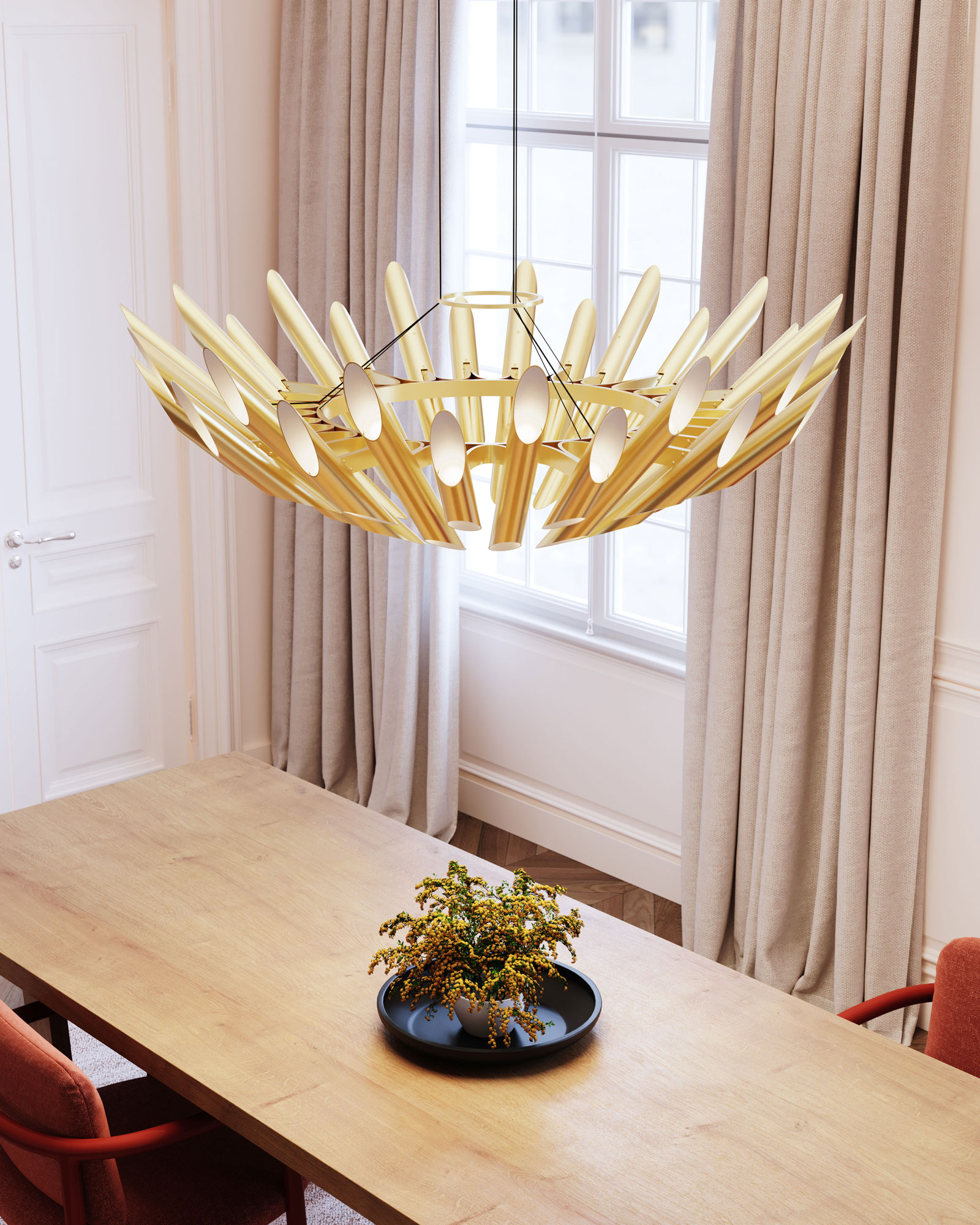 Unified and balanced, the Chimes Double Angle Chandelier offers an elegant decorative rhythm of angular illuminated tubes to maximize the optical effect of metal and light. Chimes is a luxury statement piece for classic mid-century interiors and scaled for a variety of hospitality and commercial installations. Power supply in canopy. Dimmable with ELV (Trailing-Edge), Incandescent (Leading Edge), and 0-10V type dimmers.