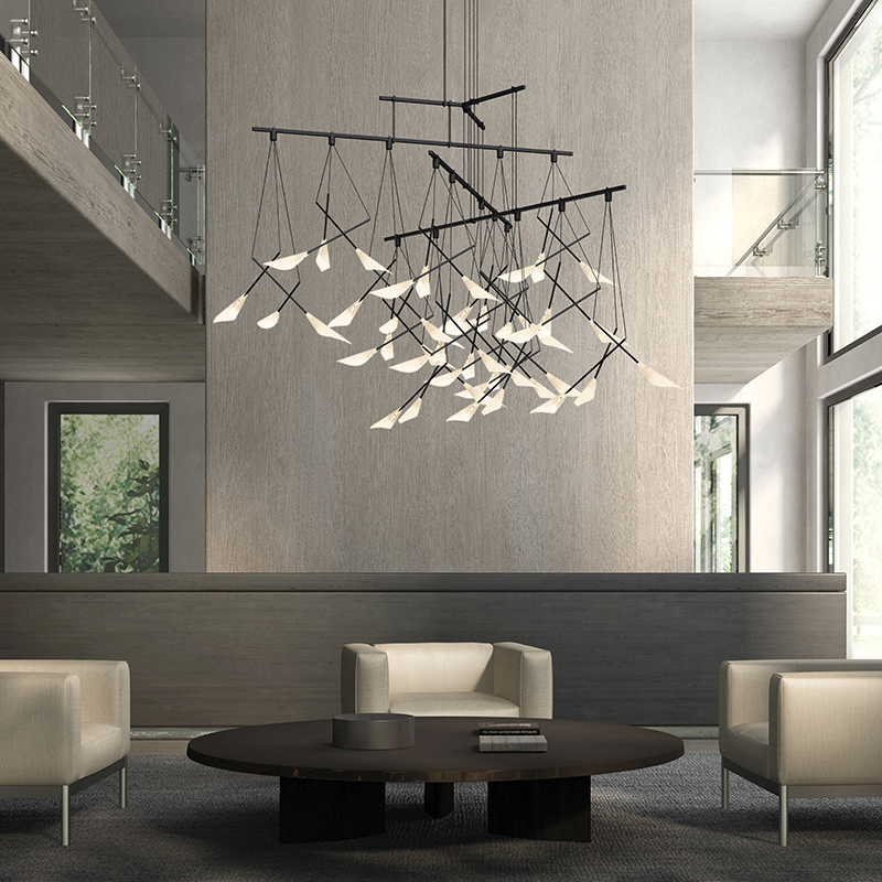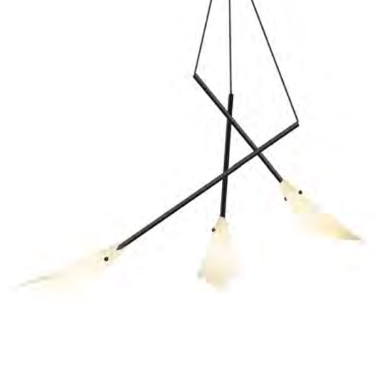 The Suspenders 4-Tier Tri-Bar Chandelier with (6) 9 Inch Calla Luminaires and (9) 18 Inch Calla Luminaires. Finish in Satin Black with white polymeric material rolled into calla lilly-shaped petals. 6.5 inch diameter power feed with field-cuttable 6 foot cord hangers. Includes dimmable LED modules and a 120VAC input/24V output transformer which fits inside outlet box. UL listed.