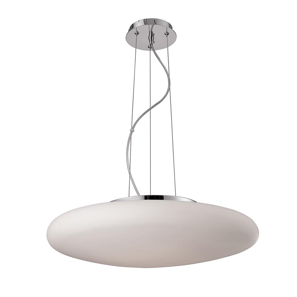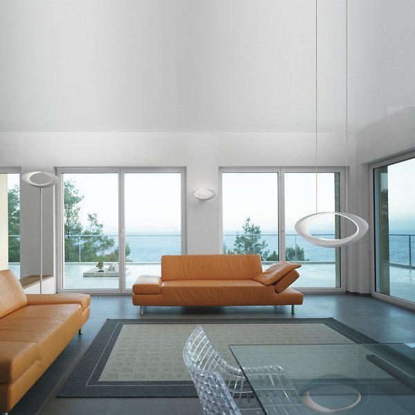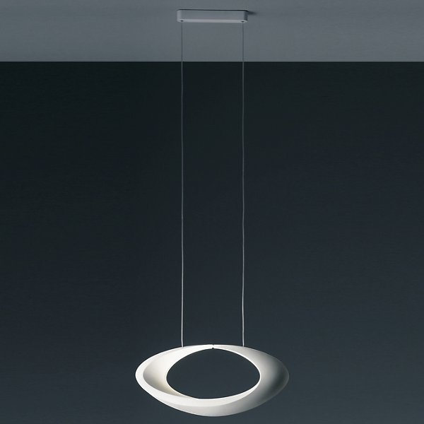 When on, the Artemide Cabildo Suspension creates intricate patterns of light and shadow on and around it. Designed by Eric Sole, the Cabildo Suspension has a specular reflector and halogen lamp concealed in the inner curve of the White painted shade. The ceiling canopy is made of White thermoplastic, with a clear cord and stainless steel suspension cables.