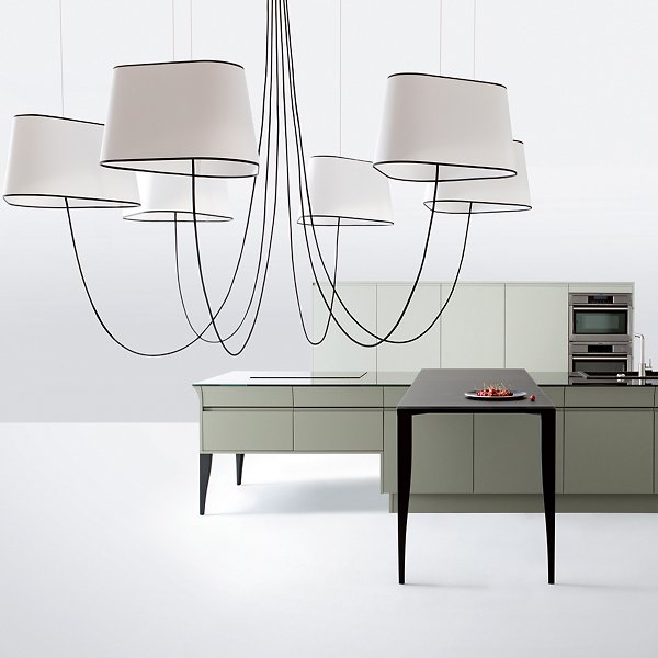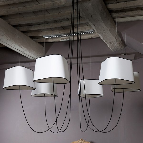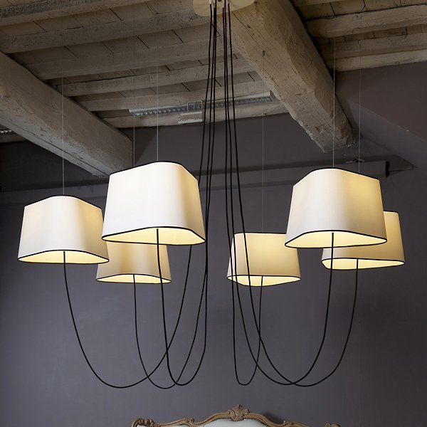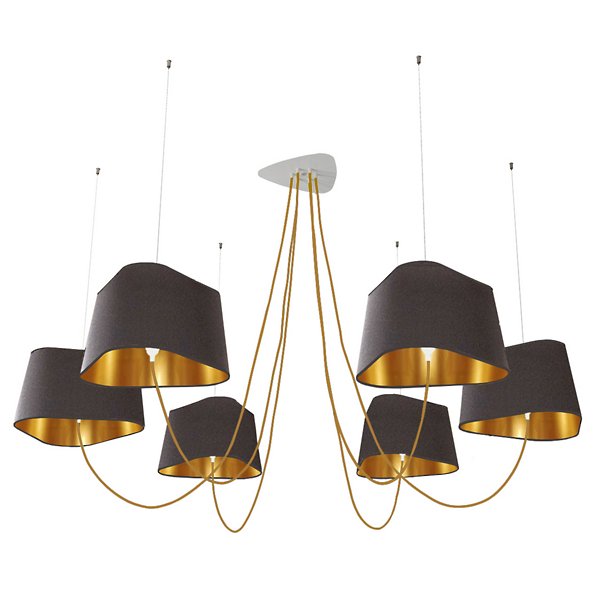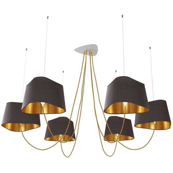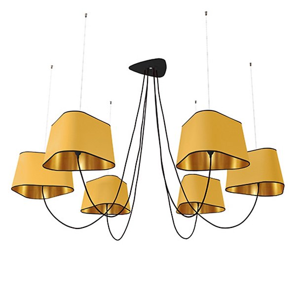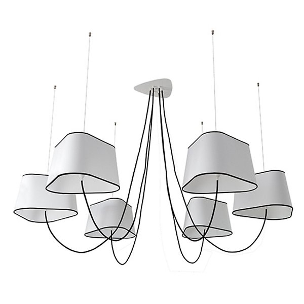 The Nuage 6 Chandelier by DESIGNHEURE lends an artful mix of minimalist simplicity and sculptural intrigue to its surroundings. A French-made design from the mind of Hervé Langlais, it relies on a central triangular canopy and a network of slender steel cables to secure an array of broadly distributed lamping around it. The lamps can be held at any height, gentled by triangular shades that echo the shape of the canopy and suggest the bow of a ship at sea.